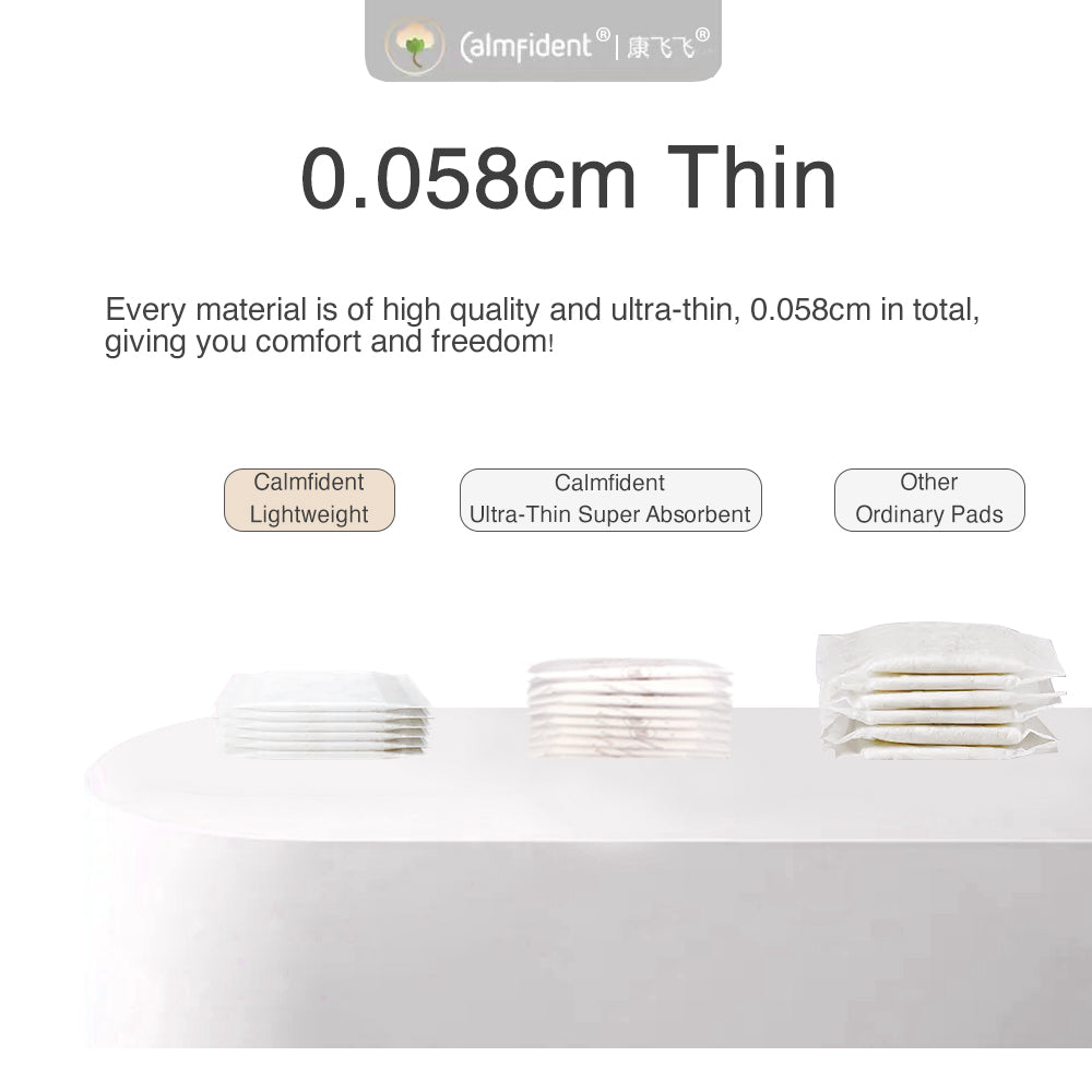 Introducing our slimmest pad yet. At just 0.058cm thin, the Calmfident Featherlight Day Pad is designed to provide high absorbency with absolutely zero burden. Ideal for light to moderate flow, this ultra-thin pad keeps you protected and comfortable without even noticing it’s there.