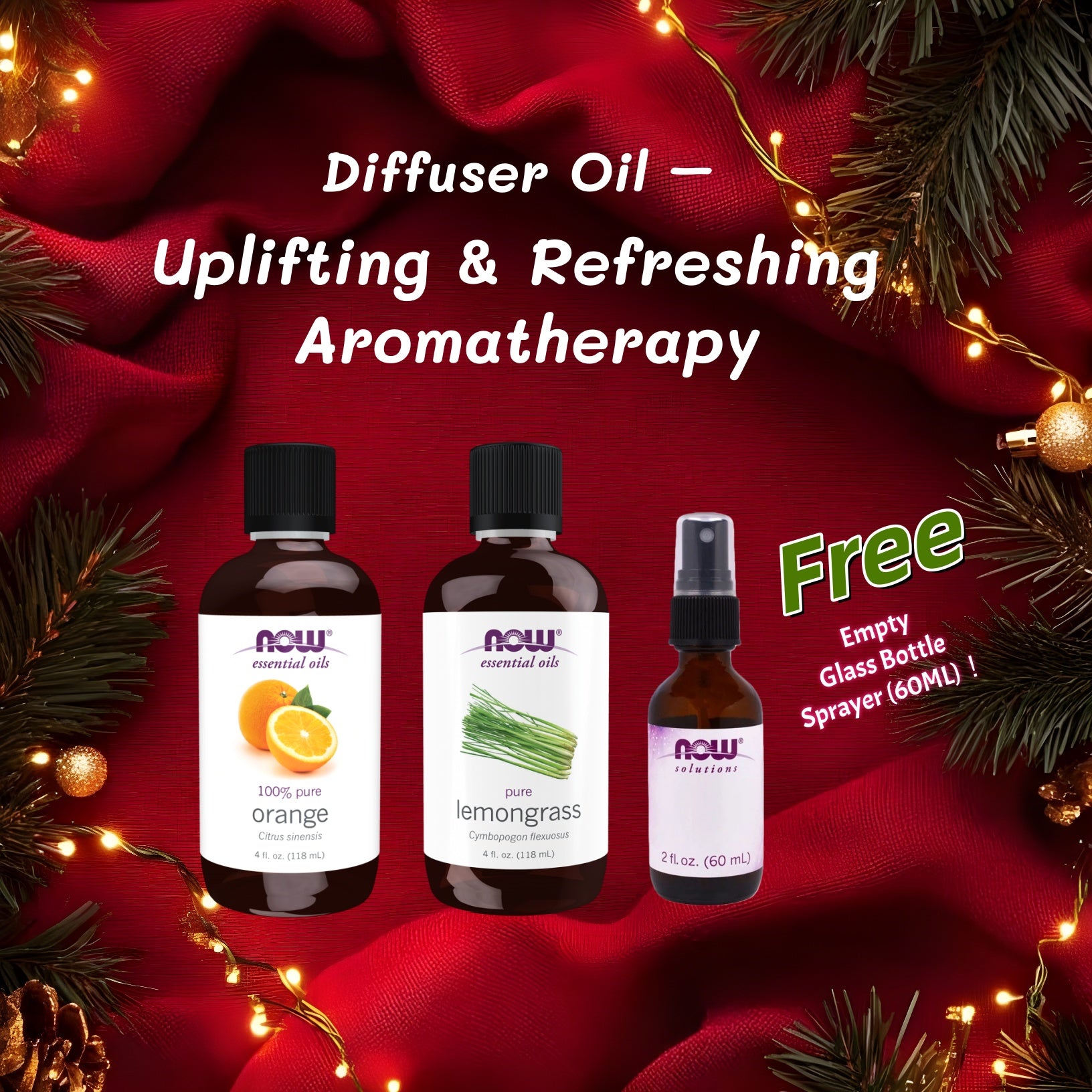 NOW Christmas Uplifting & Refreshing Aromatherapy Set – Lemongrass Oil & Orange Oil + Free Glass Sprayer