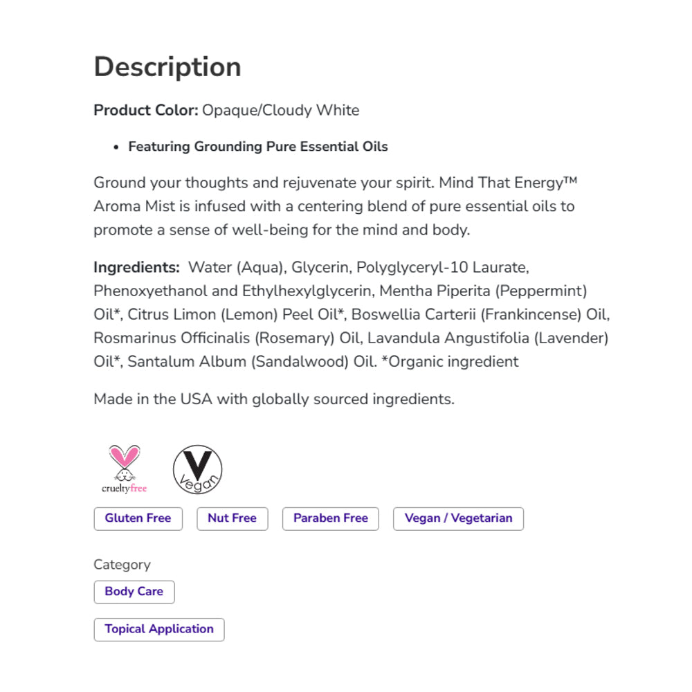 Mind That Energy™ Aroma Mist is infused with a centering blend of pure essential oils