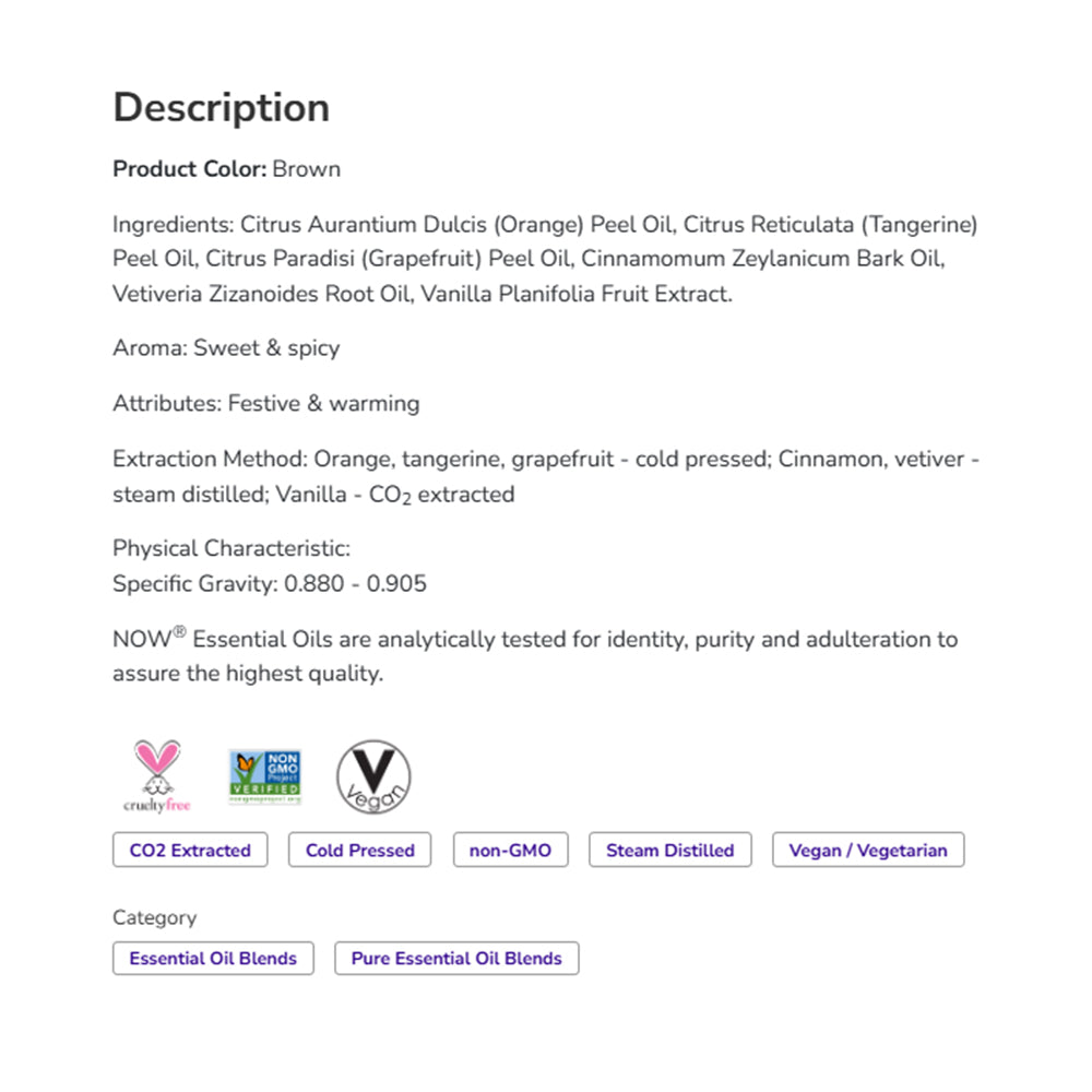 Ingredients (Computed) : Citrus Aurantium Dulcis (Orange) Peel Oil, Citrus Reticulata (Tangerine) Peel Oil, Citrus Paradisi (Grapefruit) Peel Oil, Cinnamomum Zeylanicum Bark Oil, Vetiveria Zizanoides Root Oil, Vanilla Planifolia Fruit Extract. Aroma: Sweet & spicy Attributes: Festive & warming Extraction Method: Orange, tangerine, grapefruit - cold pressed; Cinnamon, vetiver - steam distilled; Vanilla - CO2 extracted Physical Characteristic: Specific Gravity: 0.880 - 0.905 NOW® Essential Oils are analytically tested for identity, purity and adulteration to assure the highest quality.