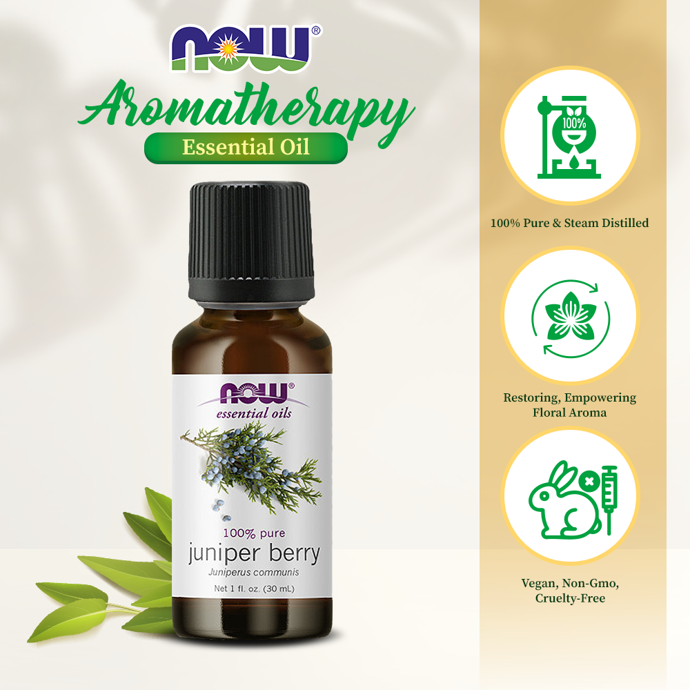 NOW Essential Oils, Juniper Berry Oil, Restoring Aromatherapy Scent, Steam Distilled, 100% Pure, Vegan, Child Resistant Cap, 1-Ounce (30ml)