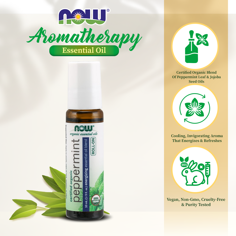 NOW Essential Oils, Peppermint Roll-On, Certified Organic, Energizing Blend, Steam Distilled, Topical Aromatherapy, 10-mL