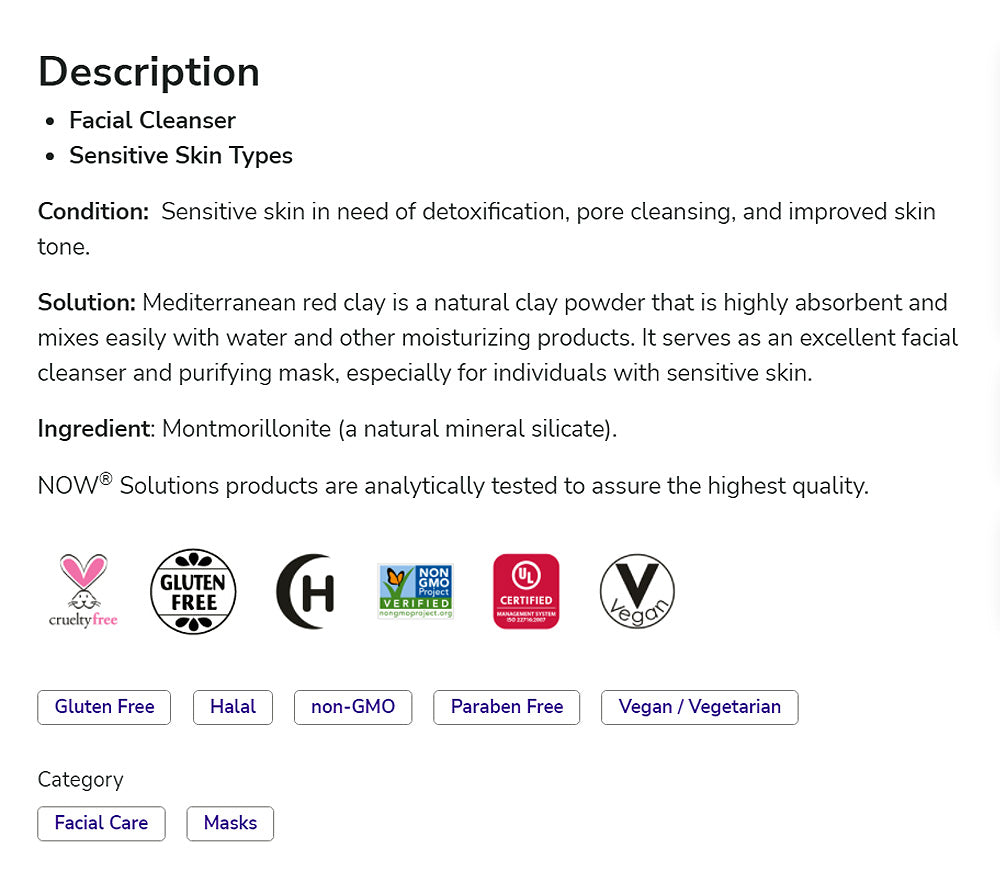 NOW Solutions, Mediterranean Red Clay Powder, pure powder for a Facial Cleaning Mask - 6 oz